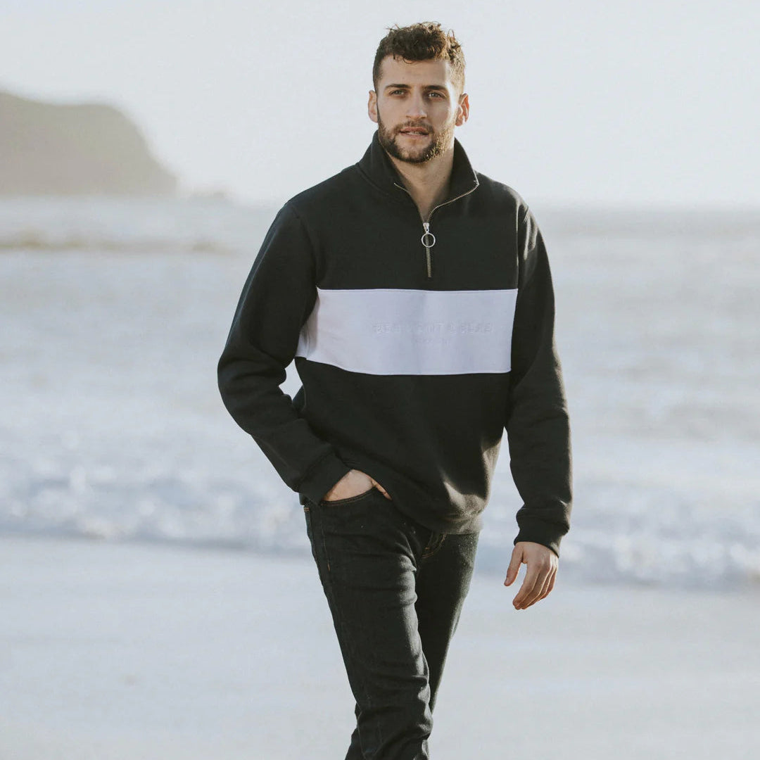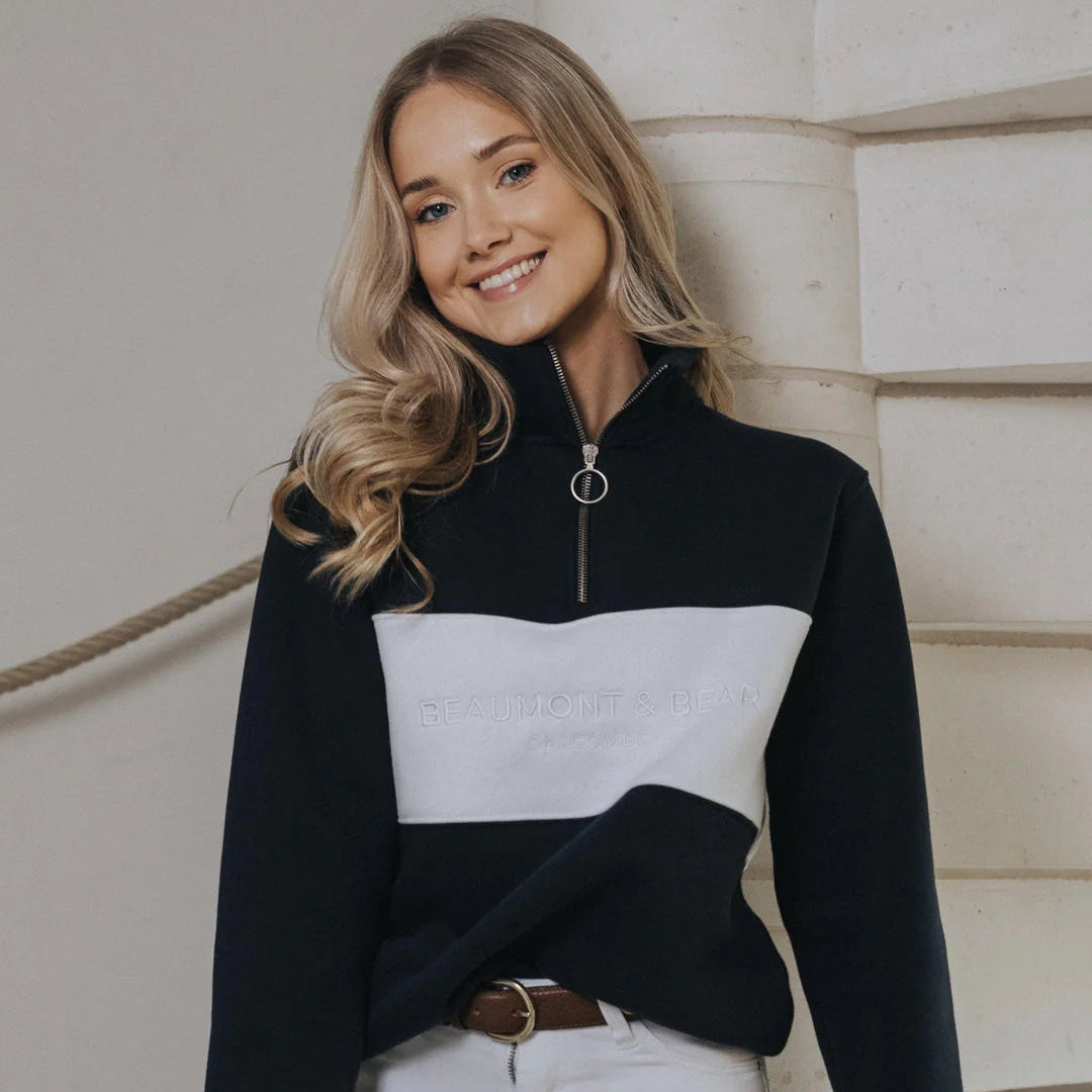 Elevate your seasonal wardrobe with the Beaumont & Bear Cliff Road Quarter Zip sweatshirt. This unisex design combines premium comfort with understated sophistication, featuring a sumptuous cotton blend that delivers exceptional softness. The striking contrast colour block design is complemented by heavy rib cuffs and signature embroidered branding at the chest and neckline. Versatile enough for casual beer garden gatherings or smart-casual occasions, it pairs effortlessly with white denim and brown boots for women, or layered under a shirt for men. Expertly crafted in Portugal, this sweatshirt is an essential investment piece for transitional dressing.