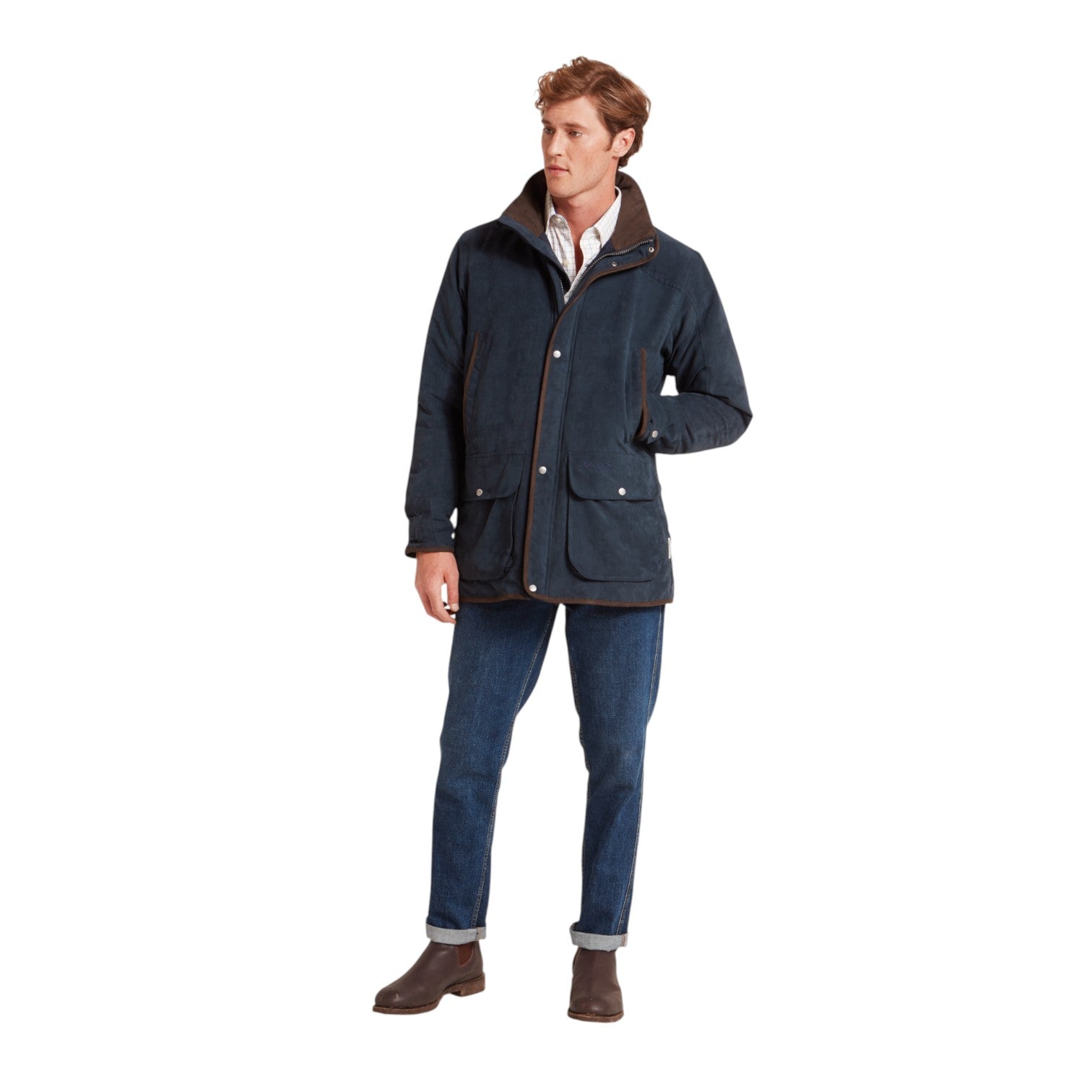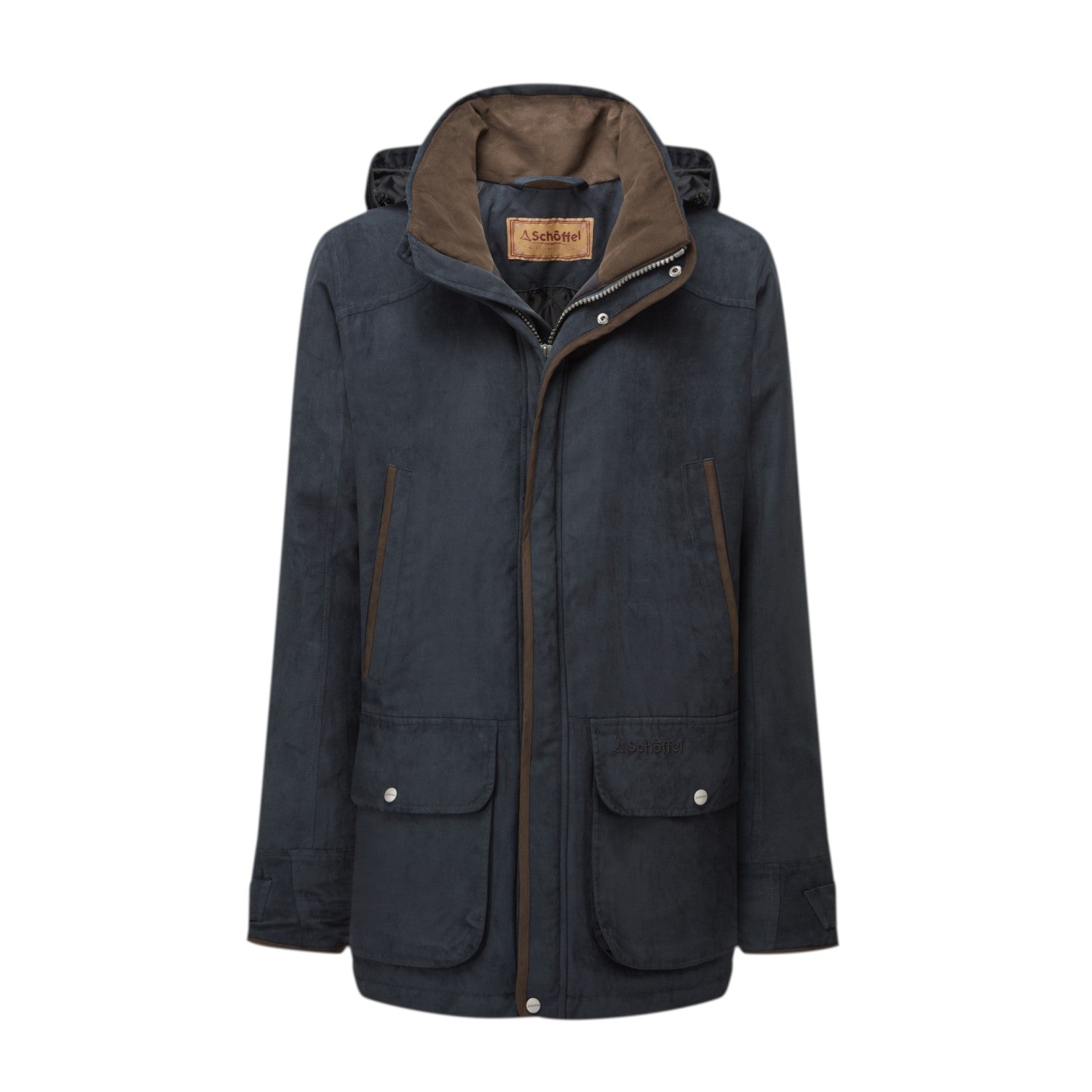 The Schöffel Oundle Country Coat in Carbon Navy features Venturi® 2-layer laminate fabric with a soft peach finish and a PFC-free water-repellent coating. It offers 100% waterproof, windproof, and breathable protection, supported by a 15,000 mm water column and 15,000 MVTR breathability rating. Lightly insulated with a diamond quilted lining, this coat ensures warmth without bulk. Practical features include a two-way YKK front zip, Schöffel signature brown trim, two internal security pockets, a detachable and adjustable hood, large bellow pockets, microfleece-lined hand-warming pockets, and elasticated adjustable storm cuffs for reliable weather defence.